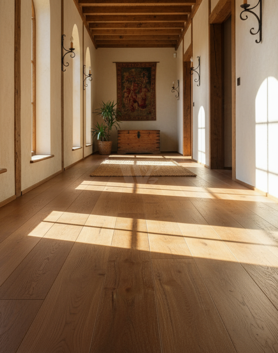 Bespoke made light distressed solid European oak flooring, crafted for character-rich interiors. Supplied with a brushed surface to enhance the grain,..