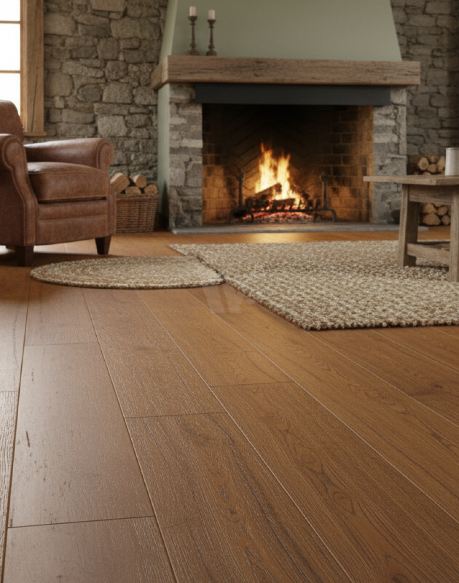 Classic 150mm (6") wide oak floorboards, finished in a rich whiskey colour using Osmo Polyx Oil. The brushed surface beautifully highlights the natural grain, adding depth and character to any room. Suitable for installation over dry subfloors such as plywood, existing floorboards, or OSB. Crafted on professional-grade machinery to ensure outstanding quality, these boards are a timeless flooring solution that combines durability, natural beauty, and warm, inviting tones.