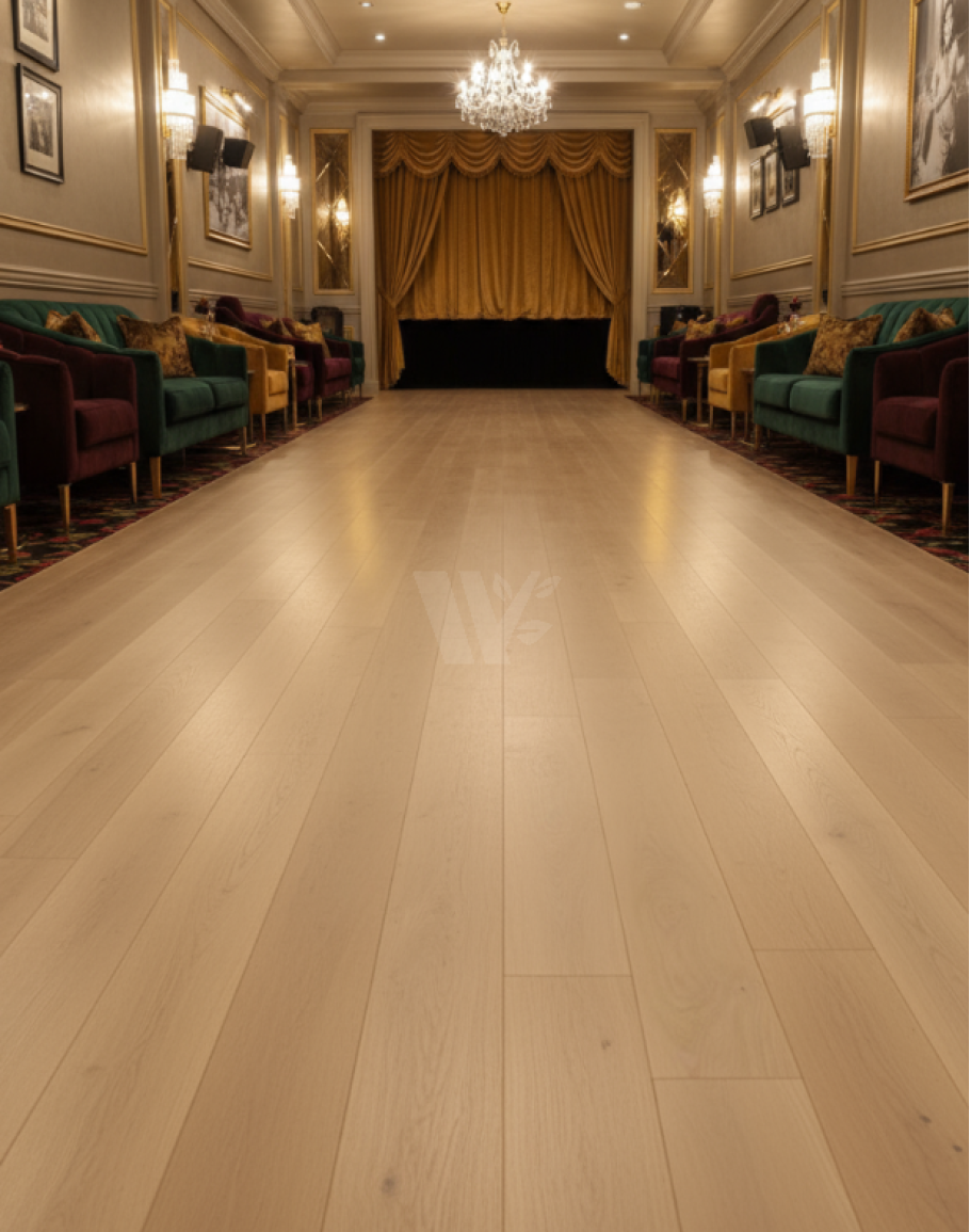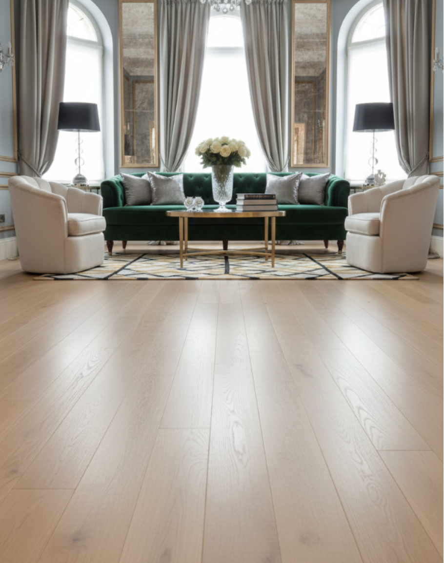 Natural oak wood flooring finished with white-hinted oil for a light, delicate appearance. The non-allergic finish and classic 150mm wide boards make it perfect for bedrooms and living rooms. Engineered construction ensures stability and easy DIY installation. The smooth finish adds warmth and softness to any space. Available from stock with quick delivery.