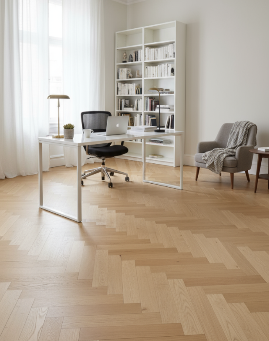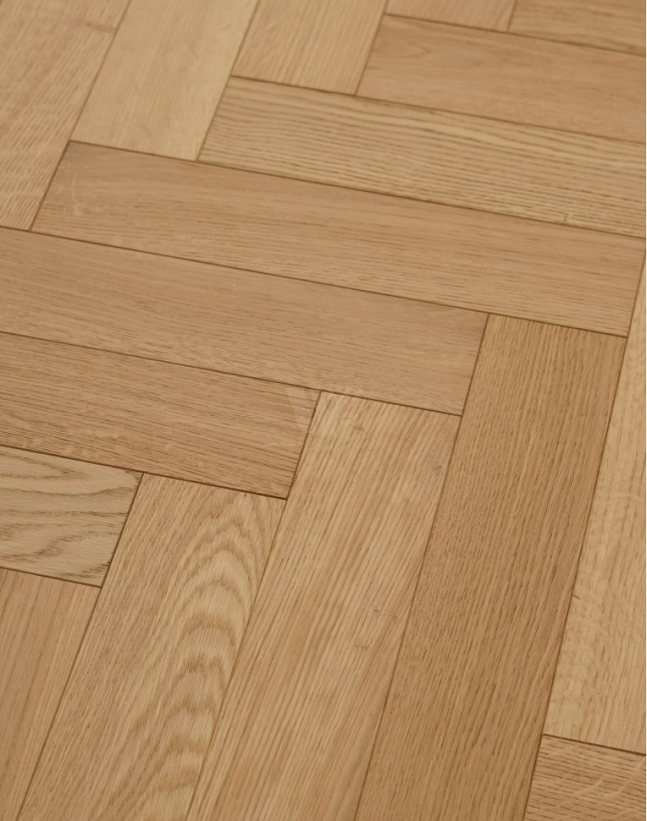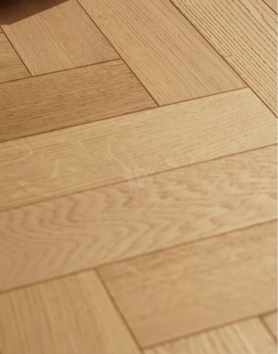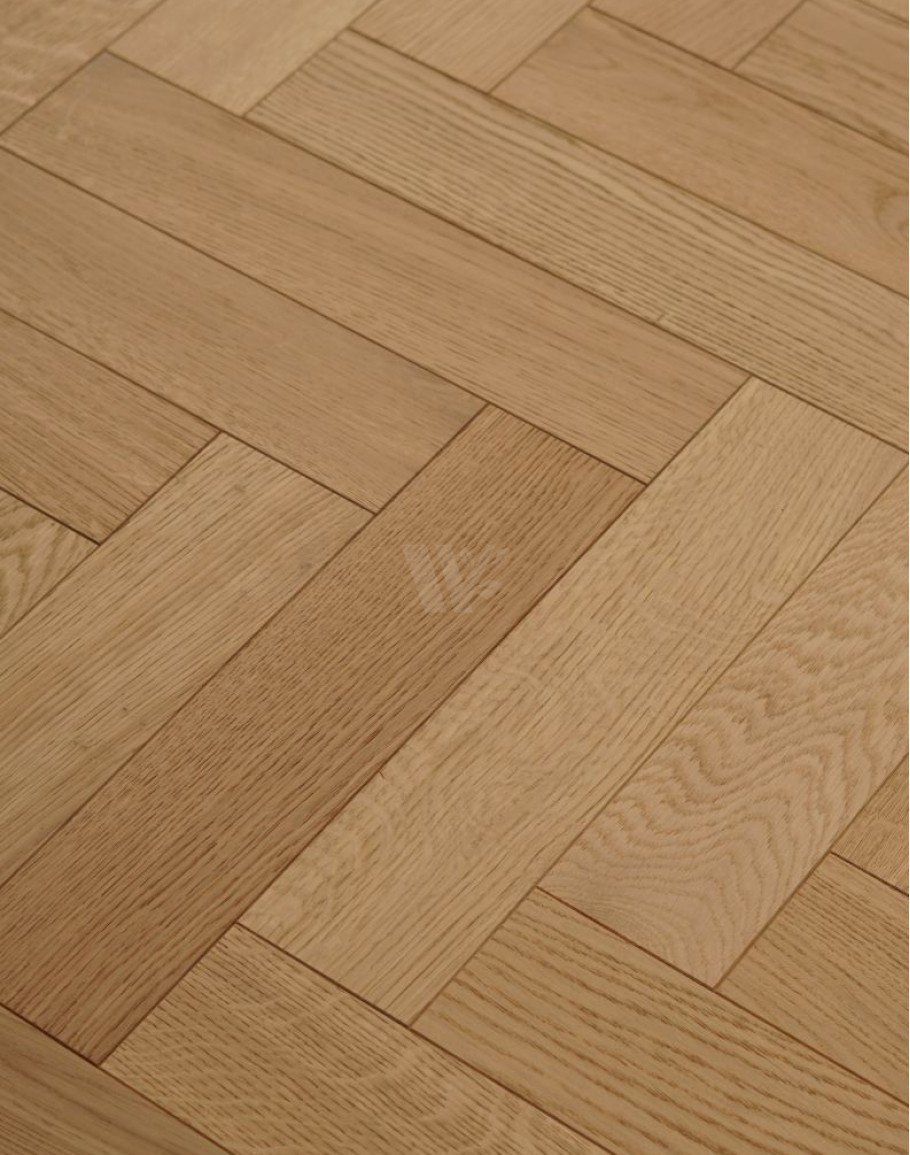 Real oak wood flooring finished with a natural oil raw effect, highlighting the wood’s authentic beauty. Constructed with layered blocks featuring a quality plywood base and a 4mm top oak layer. Equipped with tongue and groove connectors for easy installation. Suitable for laying in herringbone or classic brick patterns. Finished in a light shade, perfect for bright, open, and minimalistic interiors. Available from stock with quick delivery for your convenience.classic parquet