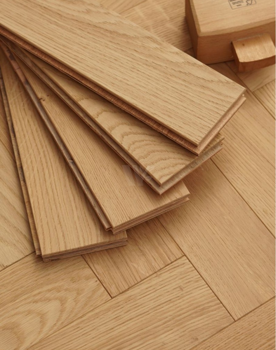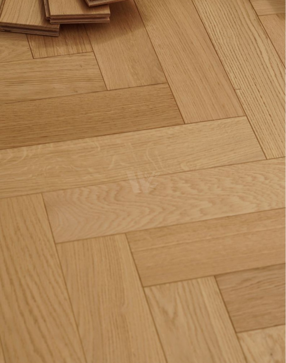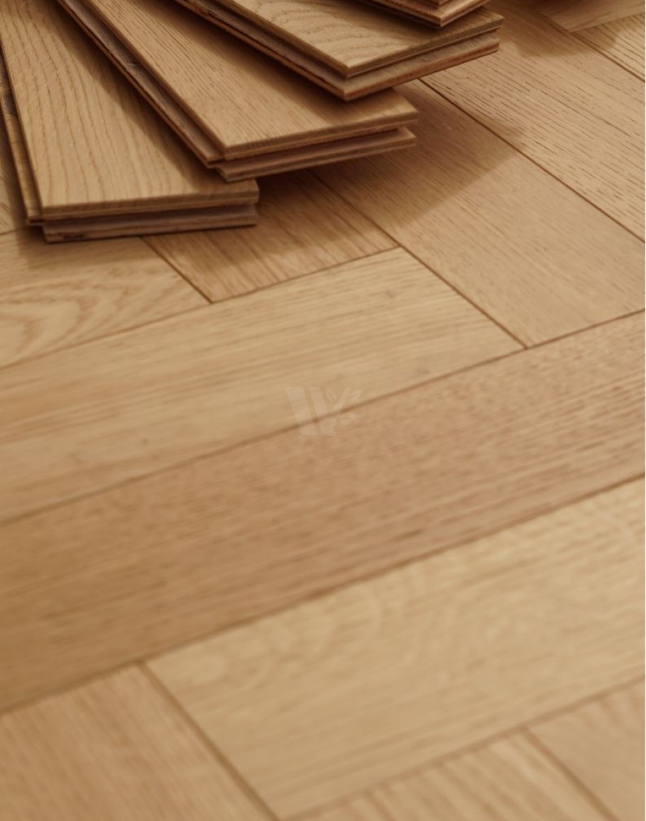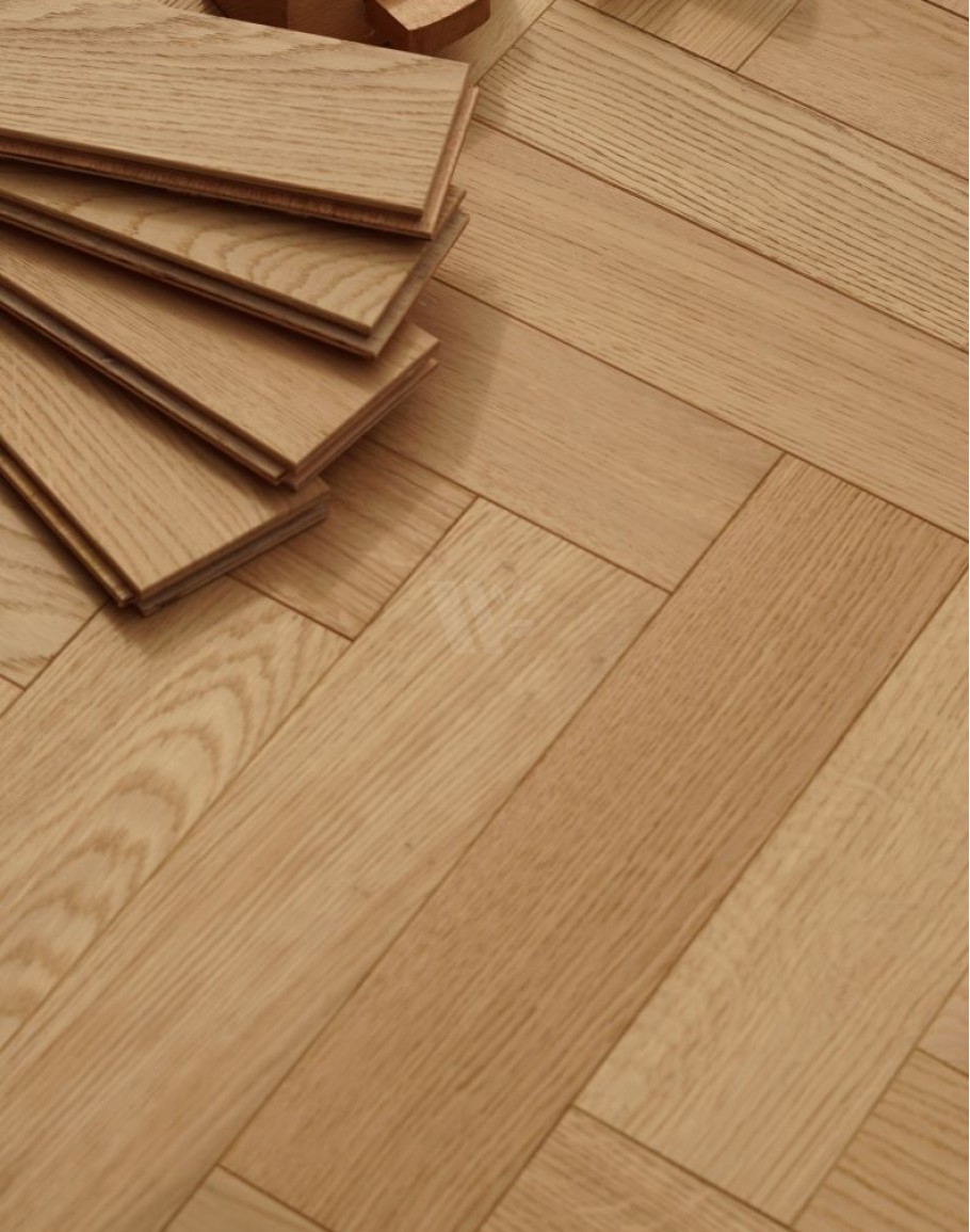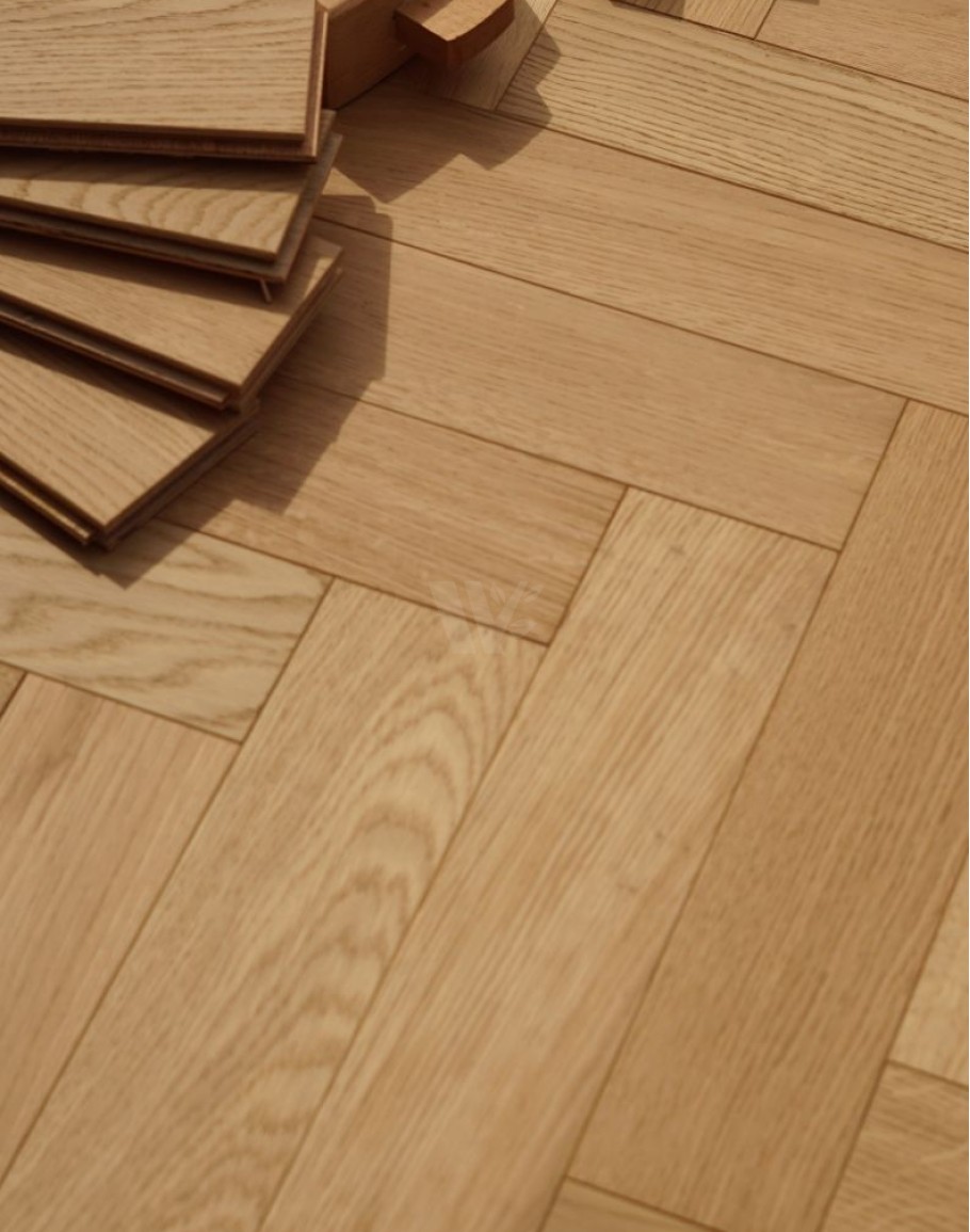 Real oak wood flooring finished with a natural oil raw effect, highlighting the wood’s authentic beauty. Constructed with layered blocks featuring a quality plywood base and a 4mm top oak layer. Equipped with tongue and groove connectors for easy installation. Suitable for laying in herringbone or classic brick patterns. Finished in a light shade, perfect for bright, open, and minimalistic interiors. Available from stock with quick delivery for your convenience.classic parquet