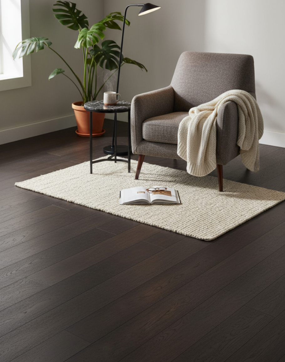 Its dramatic dark tone and long planks provide a striking, contemporary visual impact.
