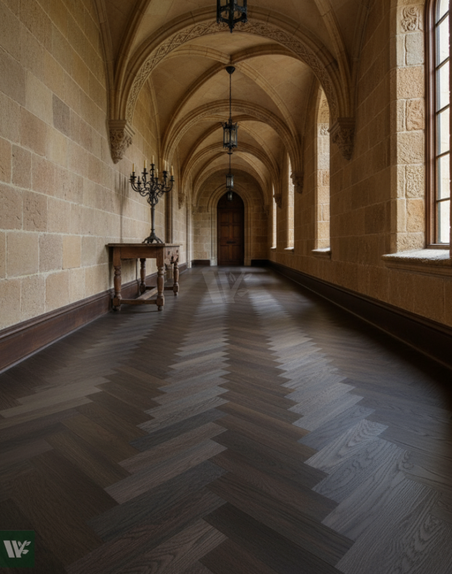 Finest Grade 22mm deep classic herringbone parquet flooring, deeply smoked for a rich brown colour. Looks stunning when finished with oil or hardwax oil. Versatile block sizes allow installation in various patterns including herringbone, double herringbone, square, brick, Dutch, diamond, and more. Precisely crafted on modern machinery for easy installation. Ideal for commercial use due to its enhanced hardness from the smoking treatment.