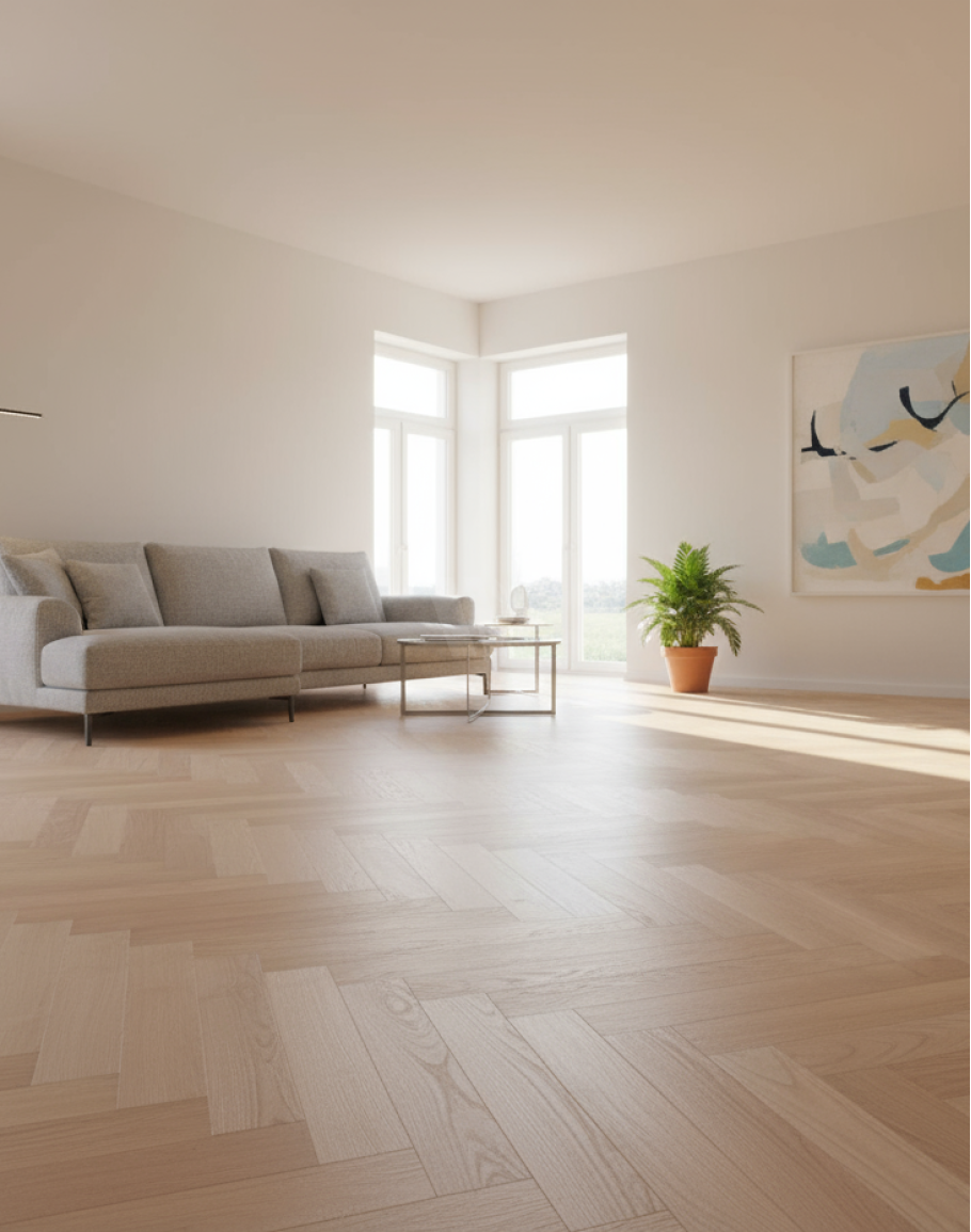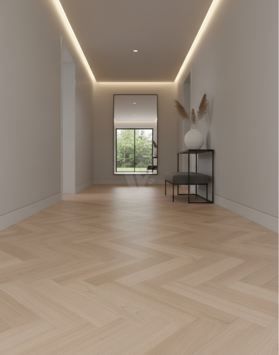 Low profile (16mm thick) classic herringbone parquet flooring made from European red oak, lighter than English oak. Classic 1ft (300mm) long blocks de..